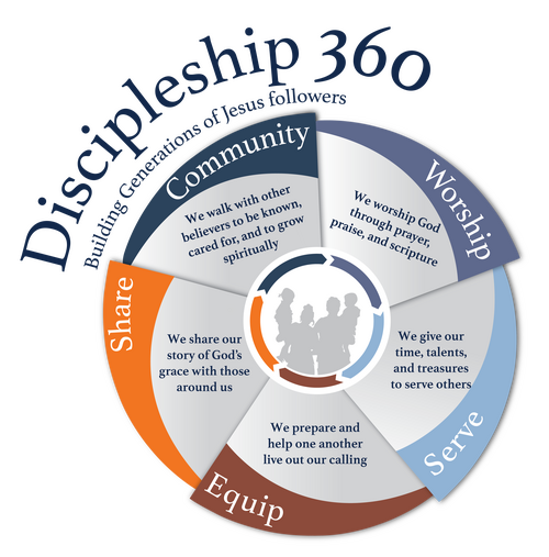 Discipleship 360 is our intentional process of making disciples who live a lifestyle motivated by grace to become more like Jesus. It focuses on five key areas of spiritual growth—worship, community, serving, equipping, and sharing—helping believers grow in their faith to actively reflect Christ in their daily lives.