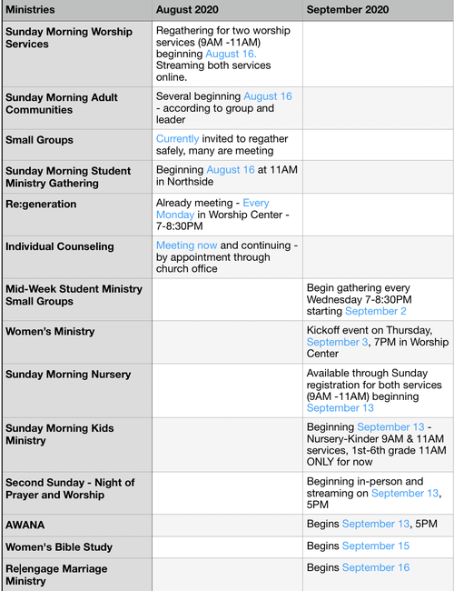 Many of our small groups are also already regathering. Schedules and details depend on each group and the group leader.