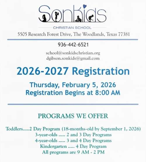 SonKids Christian School has been serving The Woodlands area since 1999. It is our purpose to provide the community with an exceptional private Christian school program. Our learning environment is inviting, non-threatening, inclusive, exciting, welcoming, developmentally appropriate, and academically challenging.